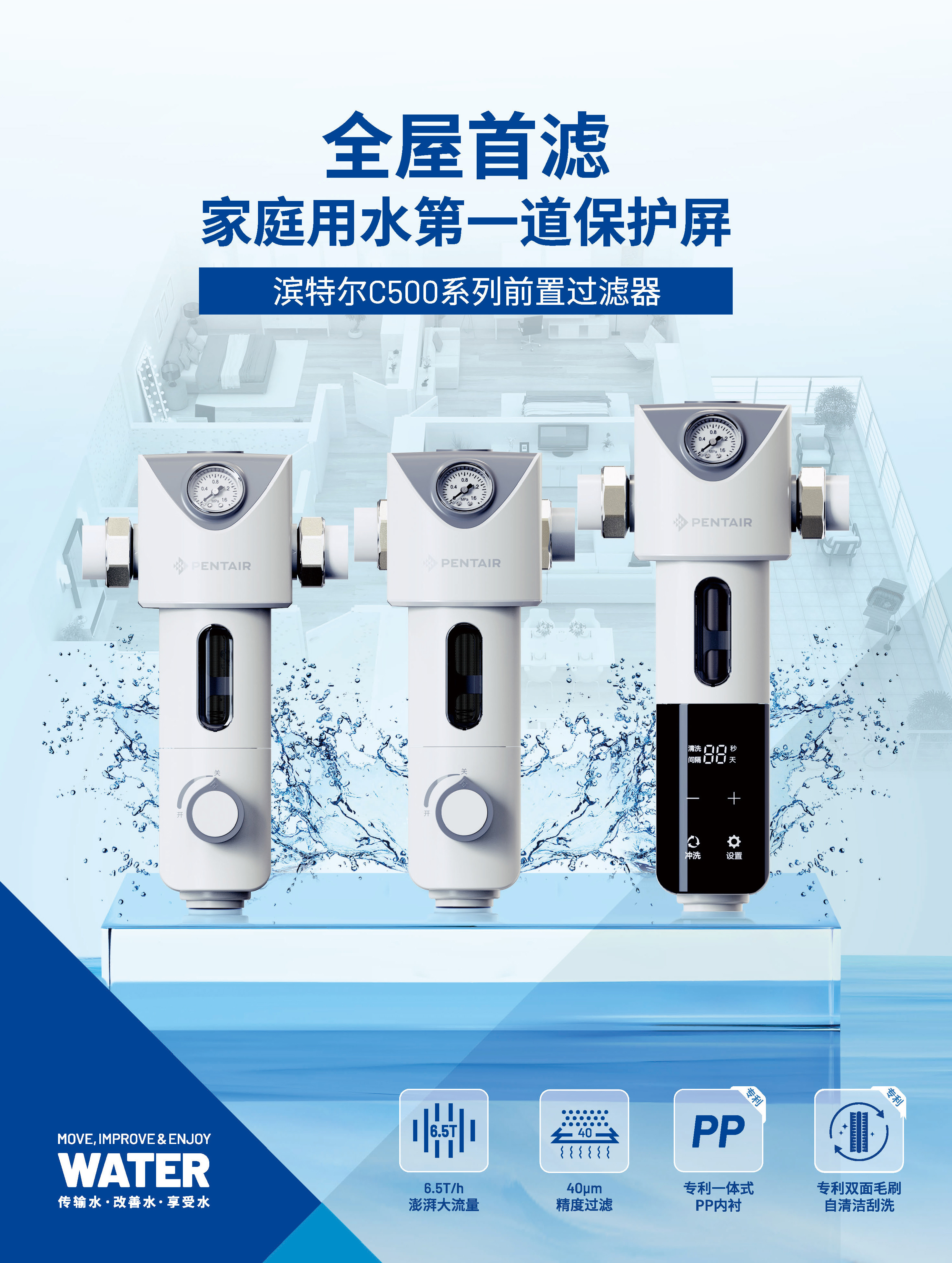 有效過(guò)濾鐵銹、泥沙、大顆粒雜質(zhì)等,從源頭捍衛(wèi)全屋用水健康,同時(shí)保護(hù)后續(xù)的涉水設(shè)備。