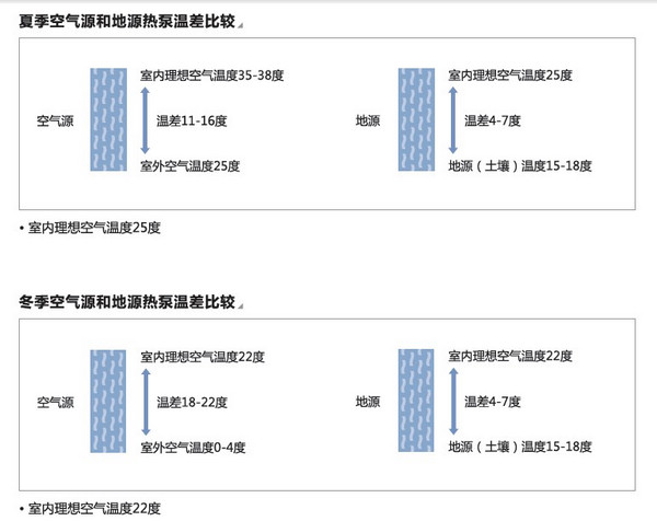 地源熱泵是利用地球表面淺層水源(如地下水、河流和湖泊)和土壤源中吸收的太陽(yáng)能和地?zé)崮埽⒉捎脽岜迷?,既可供熱又可制冷的高效?jié)能空調(diào)系統(tǒng)。相對(duì)于普通空調(diào)(空氣源熱泵)而言,地源熱泵是一種新技術(shù),簡(jiǎn)單地說(shuō)即將普通空調(diào)的換熱源改到土壤或自然水中,也就是夏天將室內(nèi)的熱量送到土壤或自然水中,而冬天從土壤或自然水中提取熱量到室內(nèi)。土壤或自然水的溫度無(wú)論冬夏恒定在15-20℃左右,而空氣溫度因冬夏或白天夜晚變化很大,從2-40℃左右,換熱源溫差很大,導(dǎo)致COP值波動(dòng)很大,能耗極高甚至無(wú)法工作。