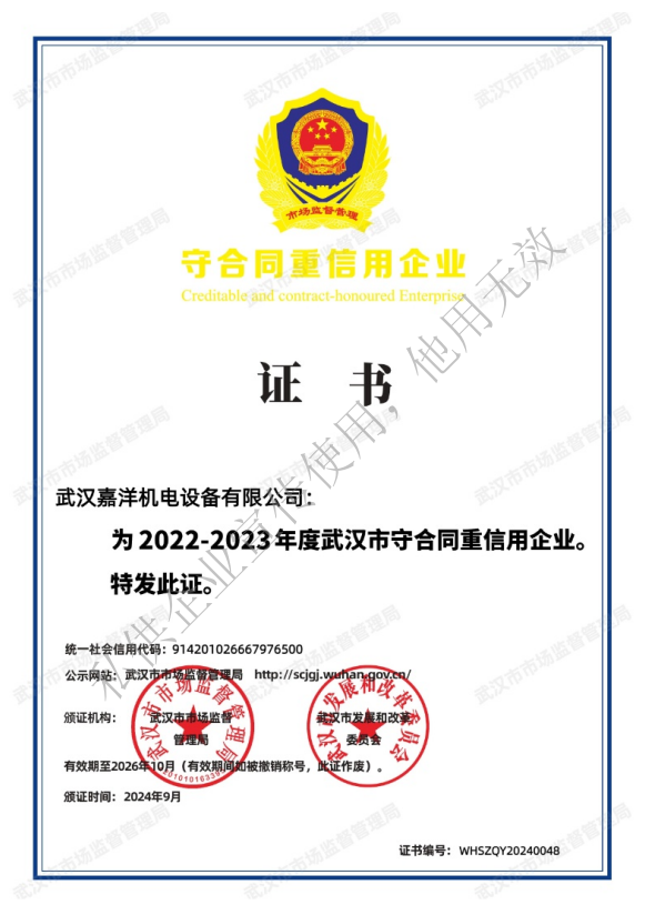 這是嘉洋機(jī)電第五次獲得省、市“守合同重信用企業(yè)”。一直以來(lái),嘉洋機(jī)電始終堅(jiān)持“以市場(chǎng)為中心,以質(zhì)量為生命,專業(yè)專注、誠(chéng)實(shí)守信”的經(jīng)營(yíng)宗旨。不斷完善產(chǎn)品質(zhì)量管理制度,嚴(yán)格履行合同,為客戶提供優(yōu)質(zhì)的服務(wù)。