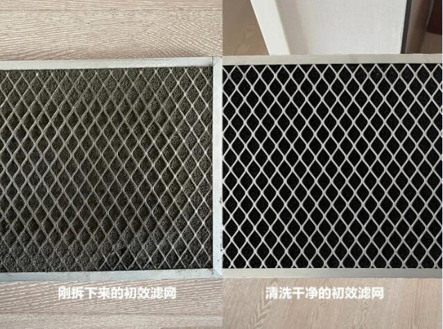 經(jīng)過長(zhǎng)時(shí)間的使用,可以看到原本白色的高效濾網(wǎng)已經(jīng)變成了黑色,初效濾網(wǎng)更是積滿了厚厚的灰塵。業(yè)主表示使用過程中設(shè)備雖然一直開著,其實(shí)并沒有太大的實(shí)際感受,沒想到拆下來(lái)的濾網(wǎng)居然這么臟,要是沒有安裝新風(fēng)系統(tǒng),這些污染物全都稀釋為自己家里空氣的一部分了,想想都后怕。