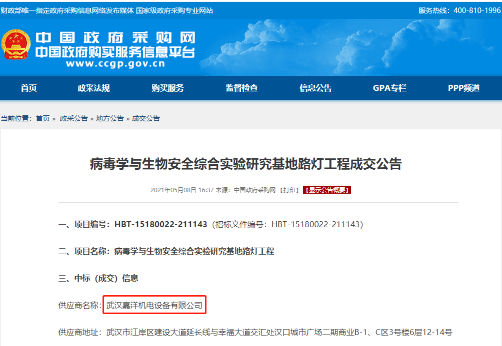 近期,中國科學(xué)院武漢病毒研究所對“病毒學(xué)與生物安全綜合實(shí)驗(yàn)研究基地路燈工程”項(xiàng)目進(jìn)行競爭性磋商采購,嘉洋機(jī)電以最高得分成功中標(biāo)。
