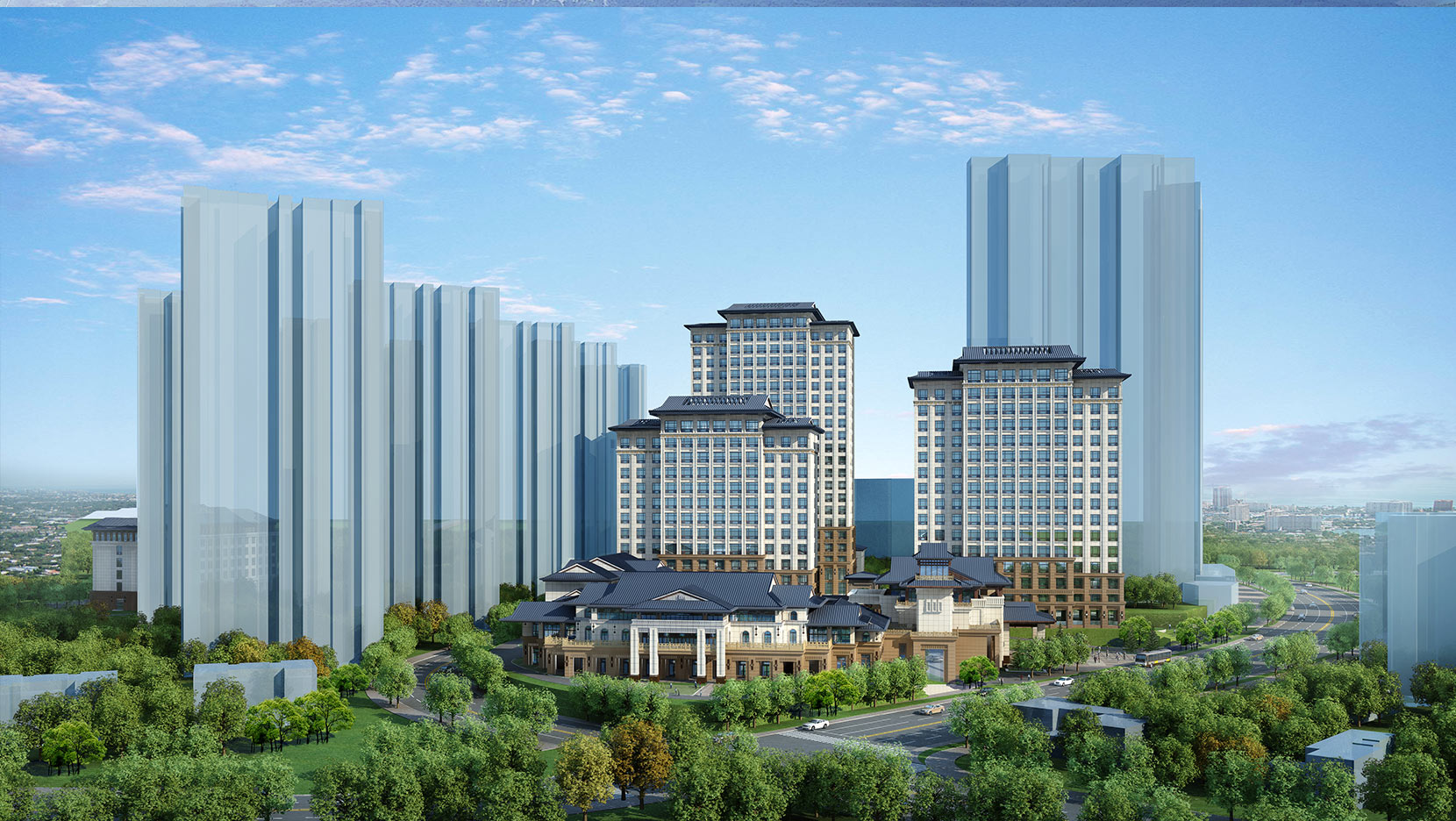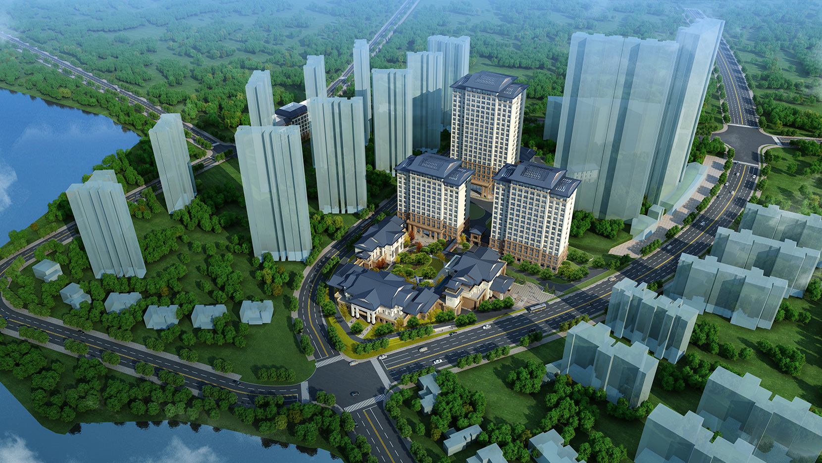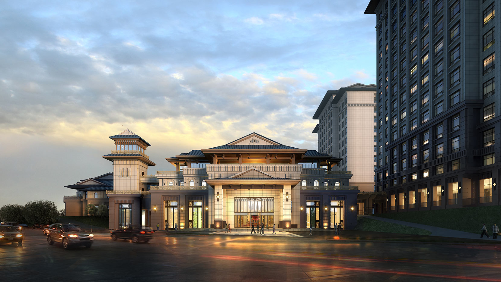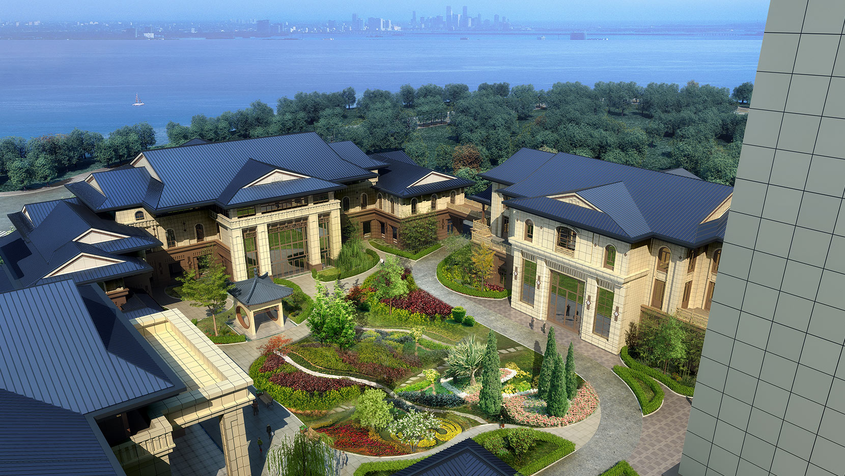 湖北省醫(yī)養(yǎng)康復(fù)中心建筑整體形態(tài)上,以中式民國風(fēng)為基調(diào)。建筑形體由南到北,形成逐漸升高之勢(shì),沿湖建筑通過連廊、露臺(tái)深出檐的屋頂與湖景和諧統(tǒng)一。建筑空間最大化地結(jié)合庭院和湖景體現(xiàn)出居家之感,提升空間品質(zhì)。本設(shè)計(jì)充分貫徹了規(guī)劃方案設(shè)計(jì)中生態(tài)設(shè)計(jì)概念,基地四周利用地形高差種植大量階梯狀的綠化帶與綠化休閑廣場形成四面環(huán)繞的優(yōu)美景觀。