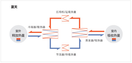 夏天的時候,室內(nèi)機吸收室內(nèi)熱量帶到室外釋放。