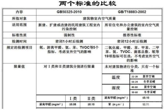 目前,行業(yè)有兩個(gè)現(xiàn)行國(guó)家標(biāo)準(zhǔn)可以參考,一個(gè)是GB50325-2010,另一個(gè)是GB/T18883-2002,前者是強(qiáng)制性標(biāo)準(zhǔn),后者是推薦下標(biāo)準(zhǔn),關(guān)于兩者的區(qū)別如圖所示: