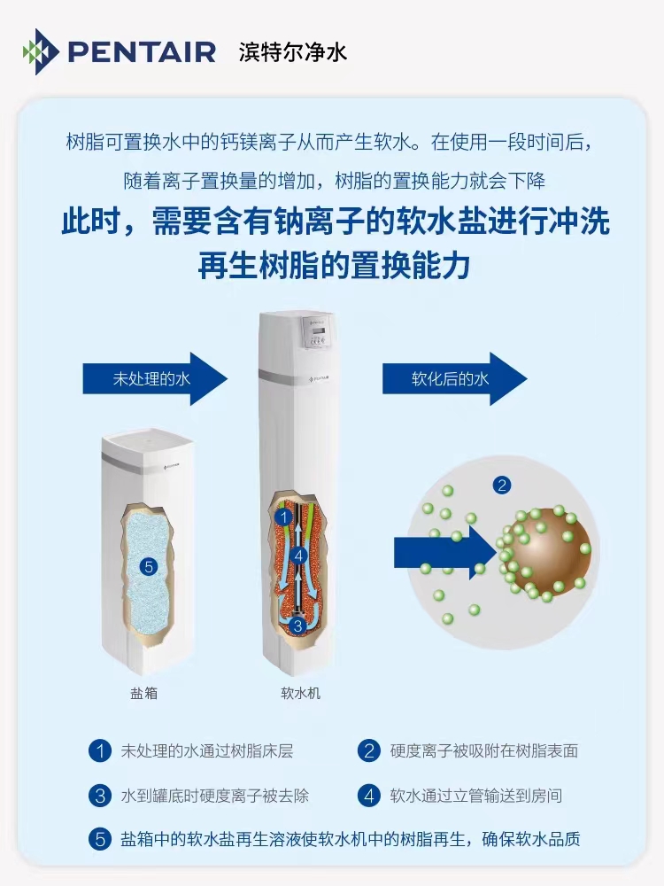 家用軟化水設(shè)備是應(yīng)用離子交換技術(shù),通過樹脂上的鈉離子與水中的鈣、鎂離子進行交換,從而吸附水中多余的鈣、鎂離子,達到去除水垢(碳酸鈣或碳酸鎂)的目的。